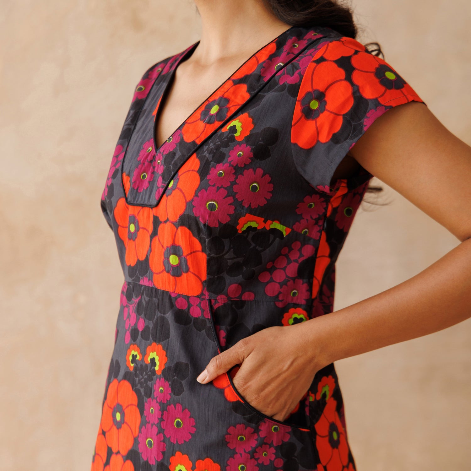 The Ada Dress is crafted from our high-quality cotton poplin, offering both structure and softness in one timeless piece. This classic empire-line silhouette features contrast piping along a flattering V-neckline, easy-wear cap sleeves, and practical side pockets for everyday functionality. A discreet side zip adds extra comfort and ease of wear.