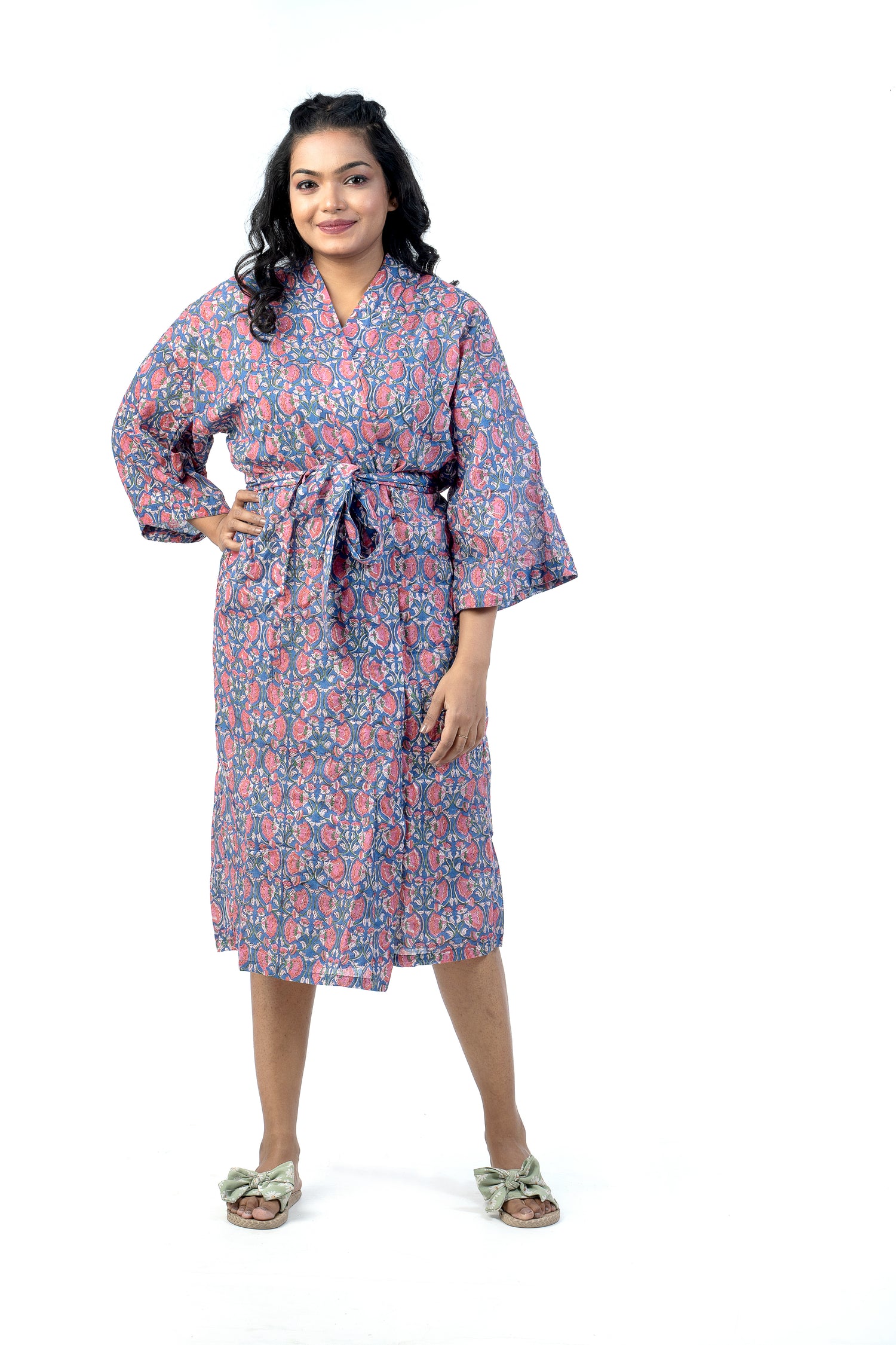 Kimono inspired robe - wide sleeves, front pockets, tie belt, generous size, hand block printed, pure cotton.