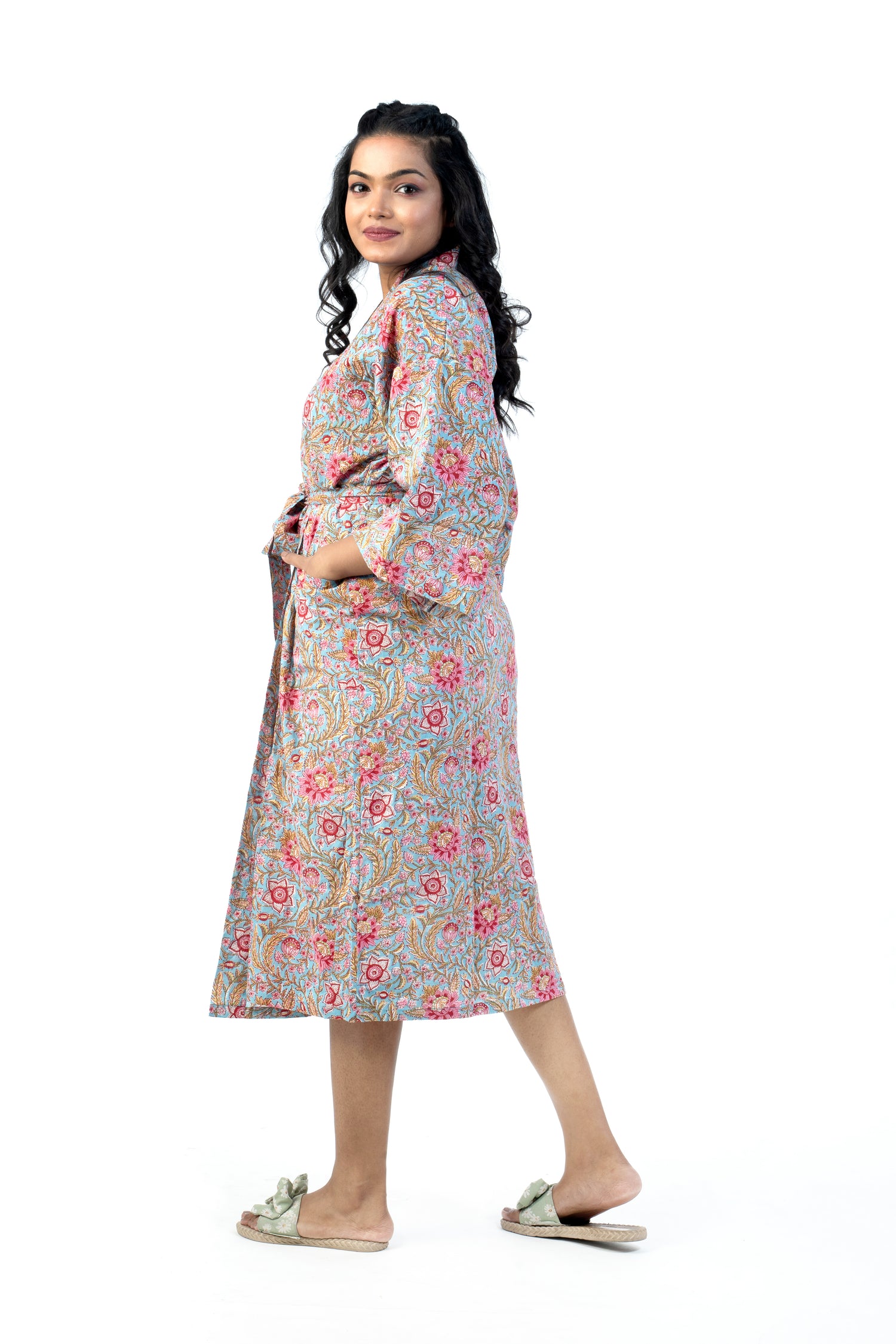 Kimono inspired robe - wide sleeves, front pockets, tie belt, generous size, hand block printed, pure cotton.