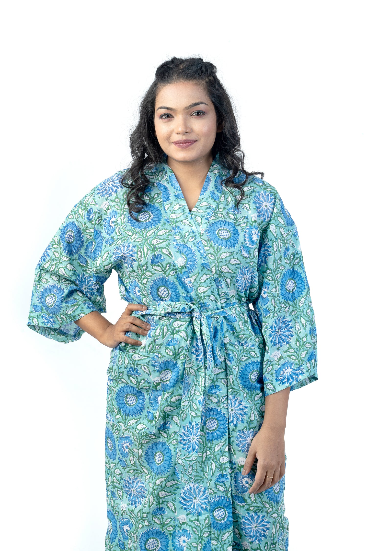 Kimono inspired robe - wide sleeves, front pockets, tie belt, generous size, hand block printed, pure cotton.
