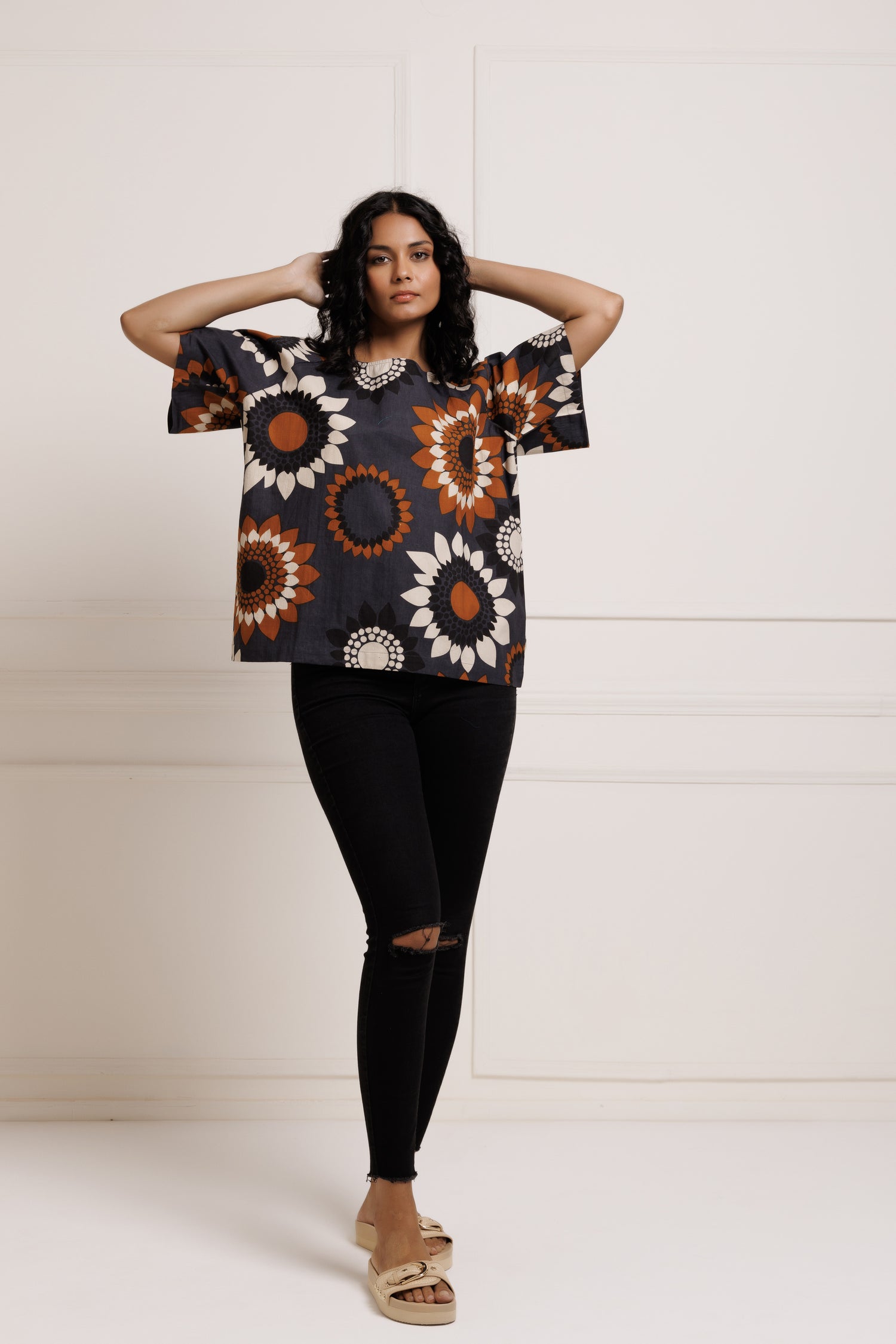 Our oversized boxy-style T-shirt is crafted with comfort in mind, featuring wide 3/4 sleeves and a cropped length that pairs effortlessly with your favorite pants. The easy-to-wear round neckline adds to its relaxed vibe.