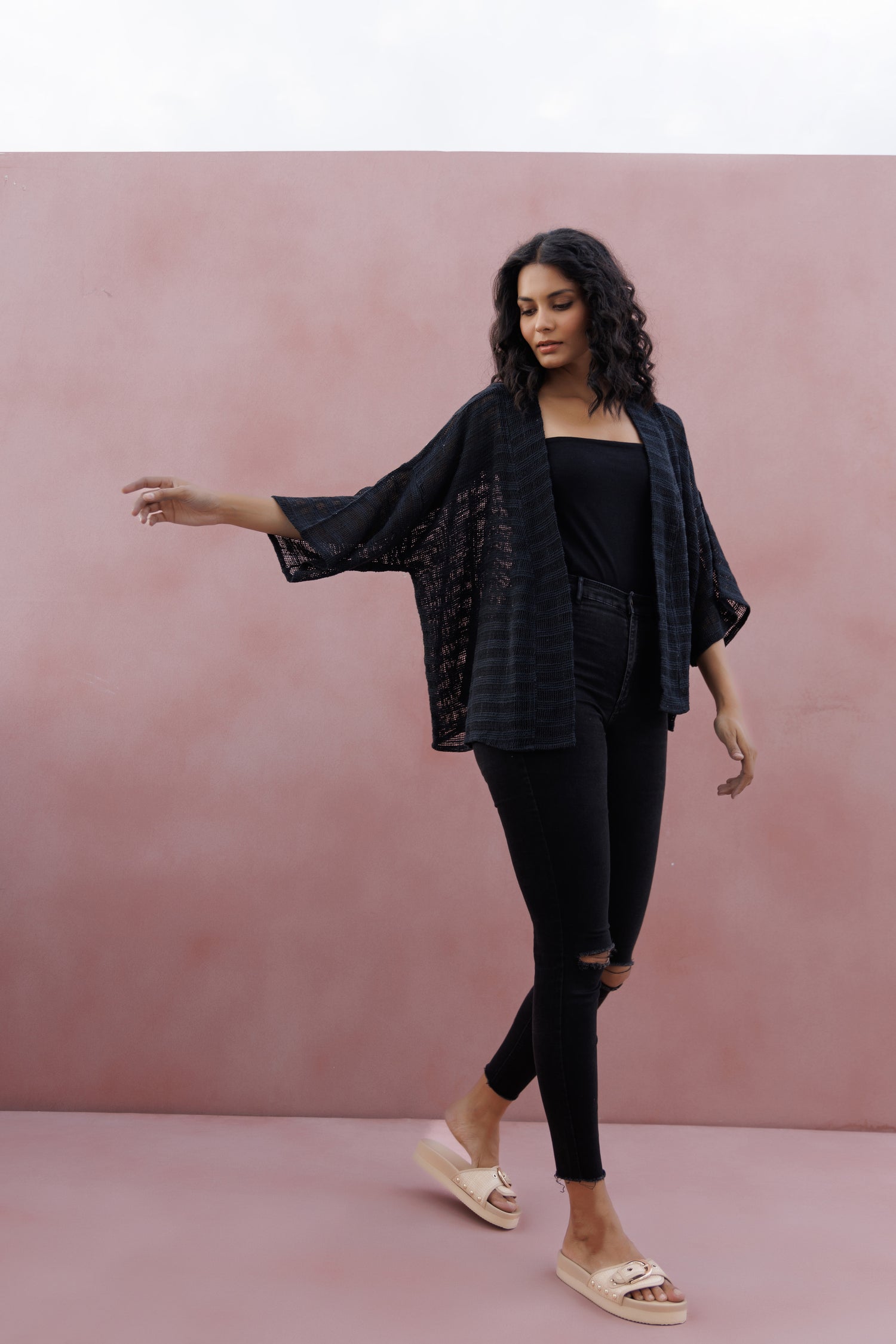 The fabric is a hemp cotton & the weave is open and textured, feeling like a knit.