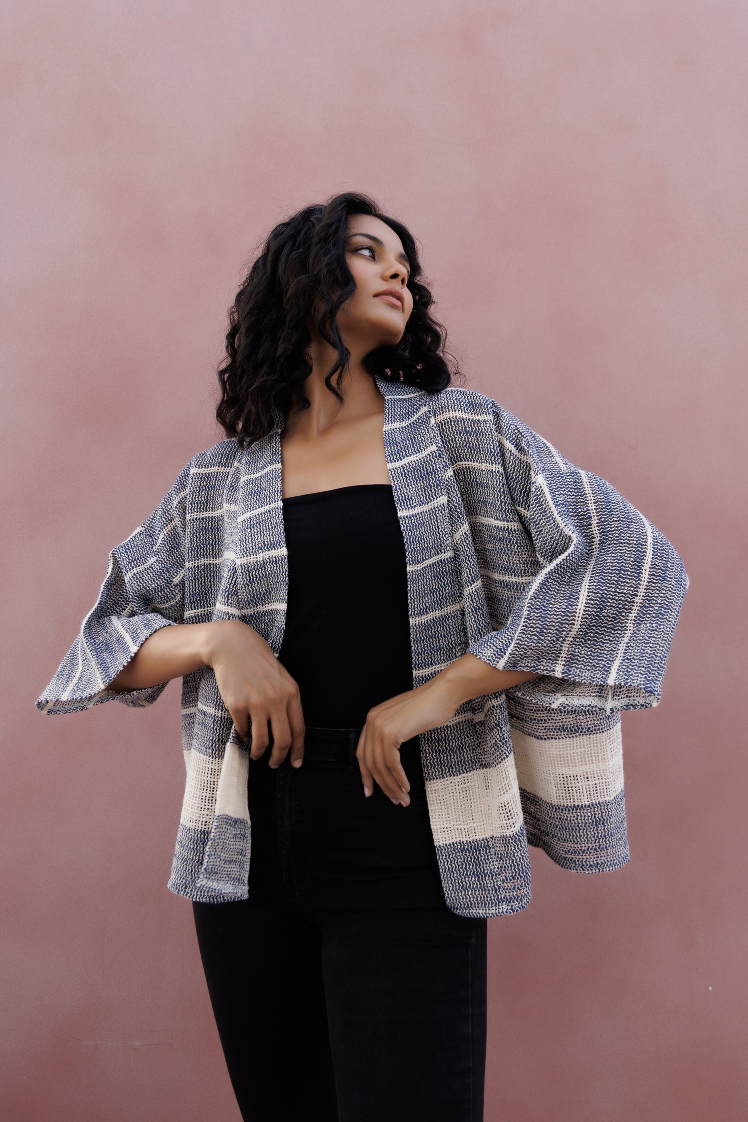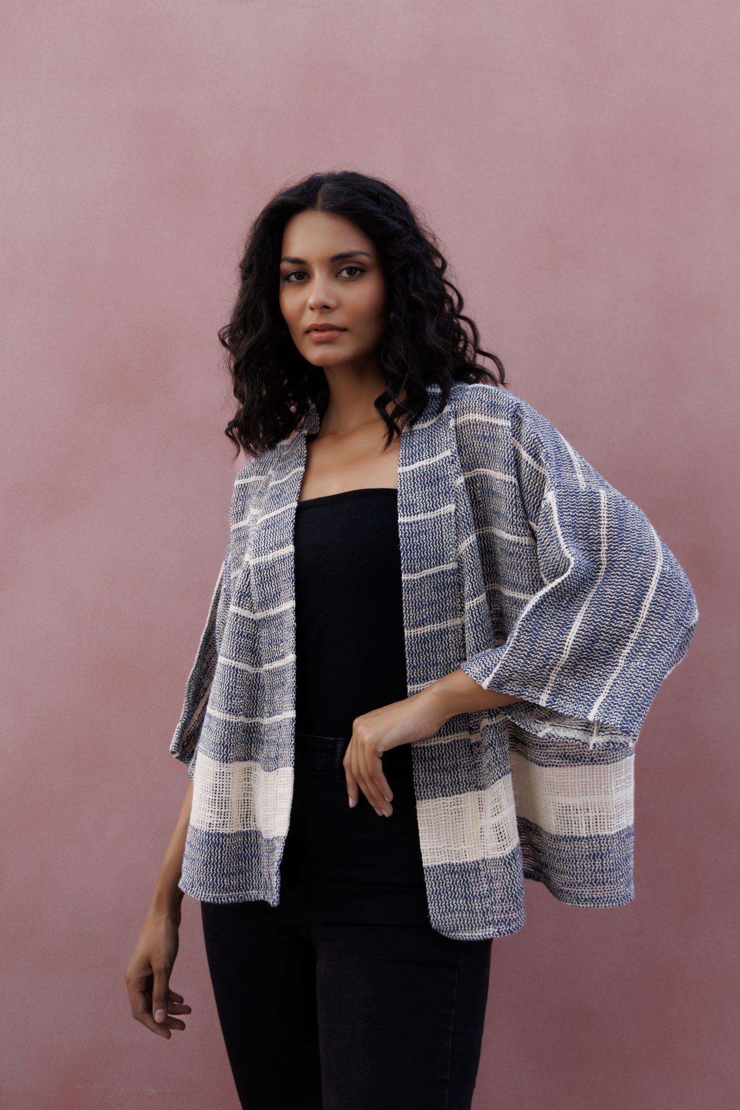 The fabric is a hemp cotton & the weave is open and textured, feeling like a knit. Please note each indigo/cream hemp weave is a different pattern, some stripes may be smaller with more or less stripes than the cardi the model is wearing. This is the nature of the weaving process.