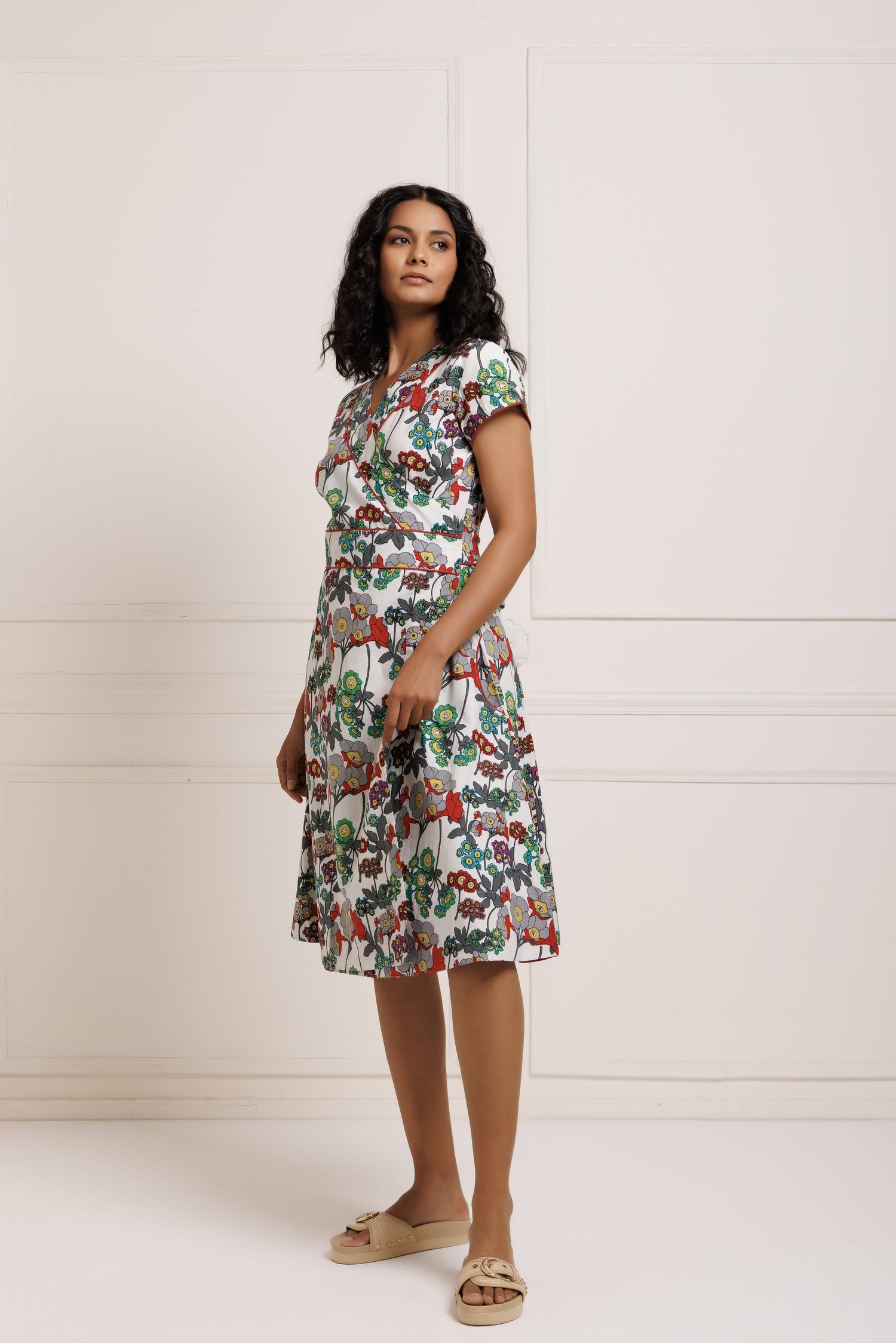 Our classic retro wrap dress, a traditional wrap around dress. Crafted from genuine hand-printed pure cotton fabric, it showcases beautiful piping and a stunning classic design.